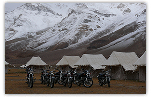 We proceed early to scale the World's second highest pass, Tanglang la 5,360 M. The ride for the next 17 Kms is a challenge for even the fittest of riders, weather being cold early in the morning, with gravelly stretches of the road consuming extra energy, riding over the altitude of 17,000 Ft will be an acid test for the mind & Body. Reaching the top is a very satisfying experience & then it's all down hill with smooth gradients till the base of the Pass. After crossing a small mountain river it is time to find civilisation again! The Chortens along the road in the villages announce our arrival in the heart of Buddhist culture. The greenery changes the landscape, and the red mountains surrounding us and reflected in the river only add to the beauty as we hit Rumtse and Gya. Gya is 50 Km from Tanglangla & over night stay in the camp.